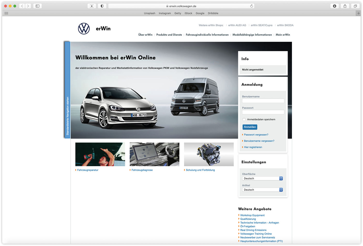Herstellerportale, wie das von Volkswagen, bieten nützliche Informationen für Werkstätten. Bildquelle: erwin.volkswagen.de